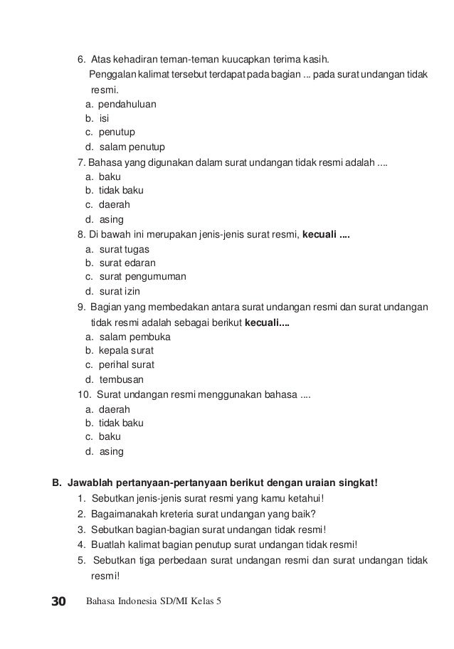 Soal bahasa indonesia kelas 5 sd semester ganjil a. Dalam bahasa indonesia surat sanggup dikategorikan menjadi dua yaitu surat resmi dan surat tidak resmi. Nama dan tanda tangan penulis 11. Alamat surat nama dan alamat yang akan dikirimi surat tertuang pada bagian ini. Dibedakan menjadi dua yaitu surat undangan tidak resmi dan surat undangan resmi.